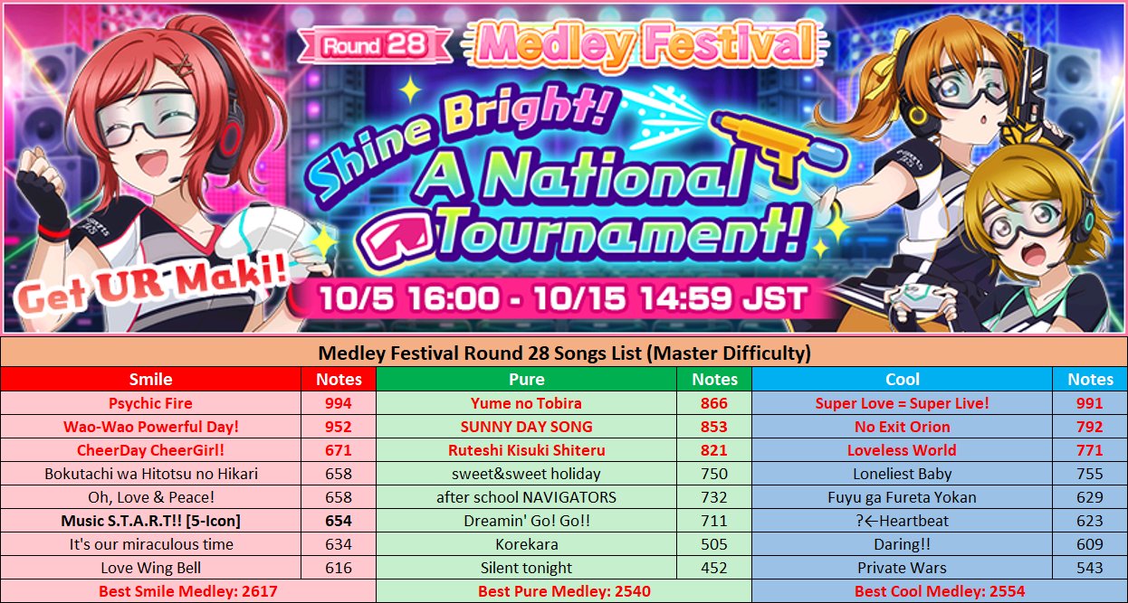 Zehel On Twitter Llsif Medley Festival Round 28 Songs List Oct 5 4pm Oct 15 2 59pm Jst Duration 10 Days Event Rewards Ur Maki Electric World Secret Ssr Nozomi Gacha Scouting